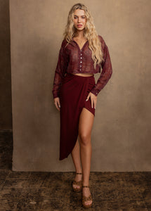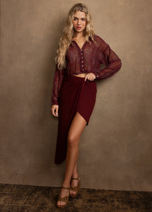 This elegant skirt combines timeless femininity with a modern twist. It features a clean-finished waistband that sits comfortably at the waist, creating a sleek and polished look. The asymmetric wrap-style front is softly gathered at one side, adding graceful texture and movement. A diagonal hem and draped overlay give the midi-length silhouette a flattering, flowy finish. Perfect for both daytime outings and evening occasions, this skirt brings effortless sophistication to any outfit.