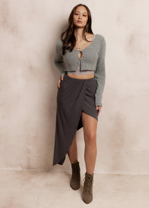 This elegant skirt combines timeless femininity with a modern twist. It features a clean-finished waistband that sits comfortably at the waist, creating a sleek and polished look. The asymmetric wrap-style front is softly gathered at one side, adding graceful texture and movement. A diagonal hem and draped overlay give the midi-length silhouette a flattering, flowy finish. Perfect for both daytime outings and evening occasions, this skirt brings effortless sophistication to any outfit.