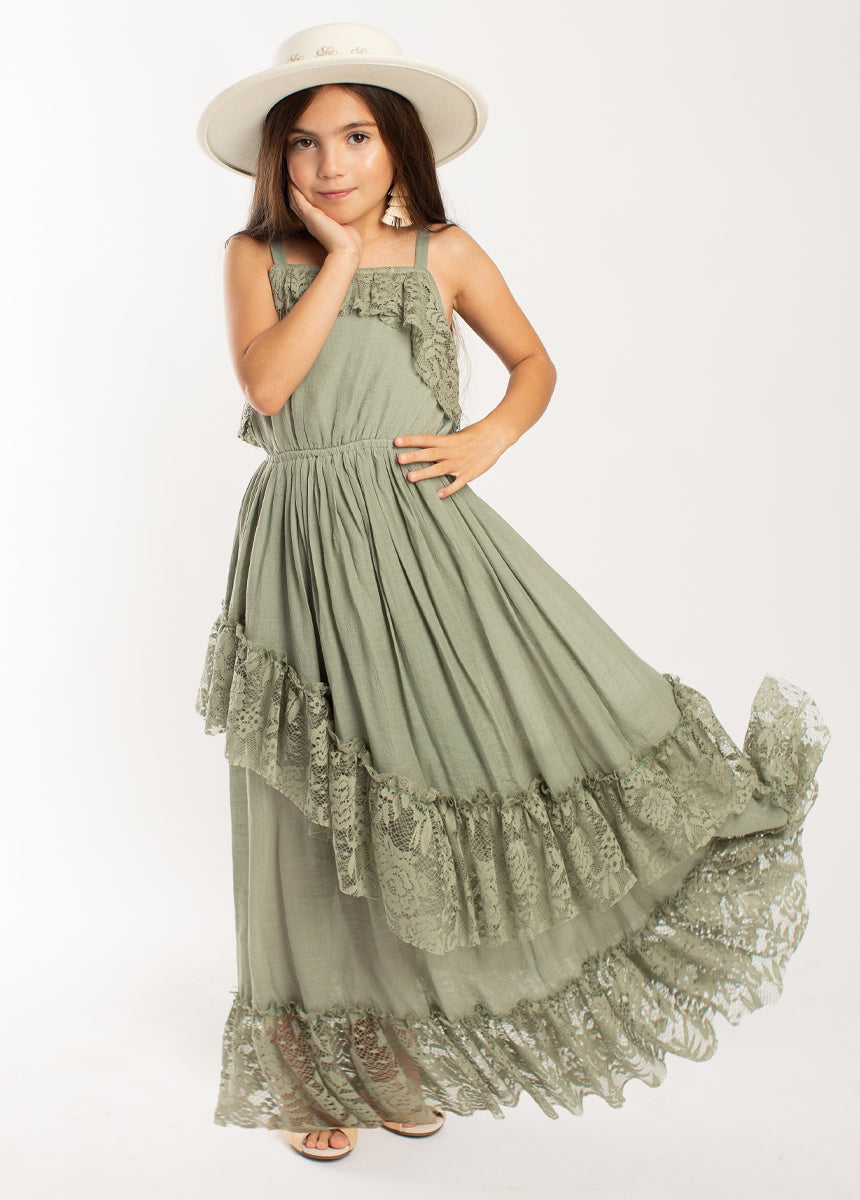 Embrace your inner girly-girl with our Siti Dress in Neutral Green, featuring a boho-inspired floral lace. This dress effortlessly blends femininity and chicness, making it perfect for any event. Complete the look with some sandals for maximum style!