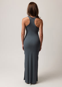 This effortless tank dress is designed with a sleek racerback that gives it a sporty yet feminine edge. The neckline and armholes feature a clean self-fabric bound finish for a polished, boutique-quality look. A side seam slit adds movement and a hint of allure, making it easy to dress up or down. The maxi length offers a flattering, elongated silhouette perfect for both casual days and chic evenings. Finished with a durable double needle coverstitch hem, this dress combines comfort, style, and lasting wear.