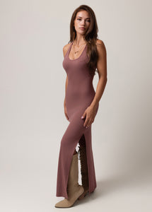 This effortless tank dress is designed with a sleek racerback that gives it a sporty yet feminine edge. The neckline and armholes feature a clean self-fabric bound finish for a polished, boutique-quality look. A side seam slit adds movement and a hint of allure, making it easy to dress up or down. The maxi length offers a flattering, elongated silhouette perfect for both casual days and chic evenings. Finished with a durable double needle coverstitch hem, this dress combines comfort, style, and lasting wear.