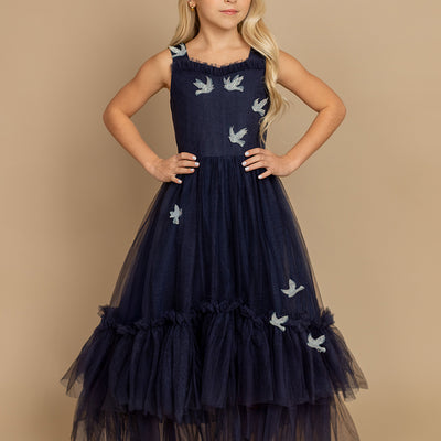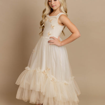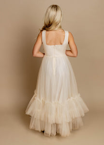 Add a touch of whimsy to her wardrobe with our charming high-low maxi dress, designed for both comfort and style. The delicate sweetheart neckline pairs beautifully with thick straps and a flattering square backline for a timeless look. A playful petticoat skirt with ruffle gives the dress a fun, voluminous silhouette, while the organza sparrow appliques add a unique and feminine detail. The invisible back zipper ensures a seamless fit, and the dress is fully lined for extra comfort and coverage. Perfect for any special occasion, this dress combines elegance and charm in one stunning piece.