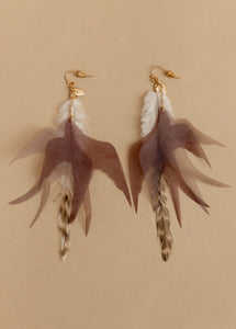 Elevate your look with the Take Flight Earrings, featuring matte gold double leaf pendants and delicate organza sparrows. Finished with natural tiger stripe feathers and a dainty chain, these earrings add an earthy, whimsical touch to any outfit.