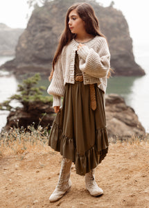 Introducing our Tatum Dress in Olive, the perfect blend of comfort and elegance for your little one. This feminine dress features playful bubble sleeves and a delicate lace collar, adding a charming touch to her look. The keyhole button closure at the center back ensures easy dressing, while the elastic waist provides a comfortable fit for all-day wear. Made from soft jersey knit fabric, this dress is both stylish and cozy, making it ideal for any occasion. Keep your child feeling and looking great with the Tatum Dress, a must-have addition to her wardrobe!