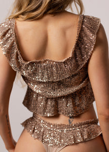- Skirted flounce around the panty, finished with 1/8" merrow stitch