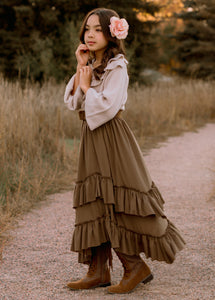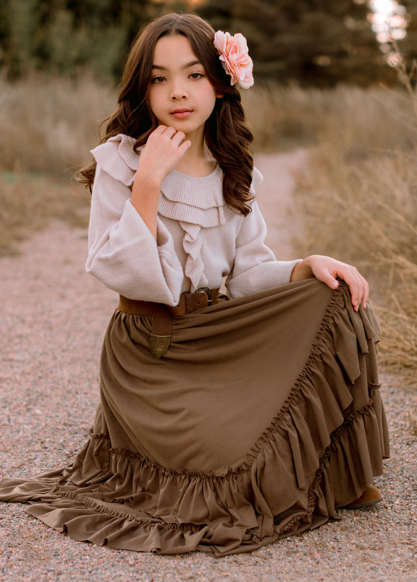 This skirt is a tiered maxi skirt with ruffles at the hems, paired with a brown belt and tan ankle boots. The skirt is high-waisted and made of a lightweight, flowing fabric. The ruffles add volume and movement to this skirt, creating a bohemian or romantic aesthetic. The brown leather belt cinches the waist, providing definition and complementing the overall color scheme. The tan ankle boots complete the outfit, grounding the look with a casual touch.