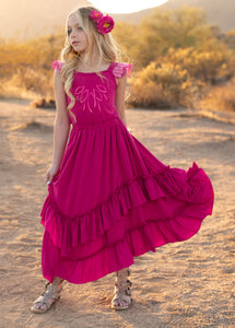 This skirt is a tiered maxi skirt with ruffles at the hems, paired with a brown belt and tan ankle boots. The skirt is high-waisted and made of a lightweight, flowing fabric. The ruffles add volume and movement to this skirt, creating a bohemian or romantic aesthetic. The brown leather belt cinches the waist, providing definition and complementing the overall color scheme. The tan ankle boots complete the outfit, grounding the look with a casual touch.