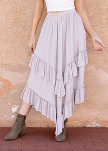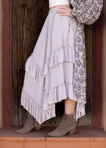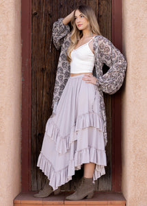 This skirt showcases a tiered, layered construction with cascading ruffle details. The asymmetrical hemline creates a flowing, dynamic silhouette that adds movement and grace. It is styled with a floral-printed duster and lace-up boots, giving it a charming, rustic flair. The fabric appears lightweight and airy, making it ideal for warm-weather outings or casual-chic ensembles. it exudes a boho-chic vibe, perfect for festival looks or casual gatherings. Overall this skirts blend feminine elegance with bohemian charm, making them versatile statement pieces for stylish, carefree outfits.
