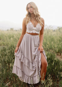 This skirt showcases a tiered, layered construction with cascading ruffle details. The asymmetrical hemline creates a flowing, dynamic silhouette that adds movement and grace. It is styled with a floral-printed duster and lace-up boots, giving it a charming, rustic flair. The fabric appears lightweight and airy, making it ideal for warm-weather outings or casual-chic ensembles. it exudes a boho-chic vibe, perfect for festival looks or casual gatherings. Overall this skirts blend feminine elegance with bohemian charm, making them versatile statement pieces for stylish, carefree outfits.