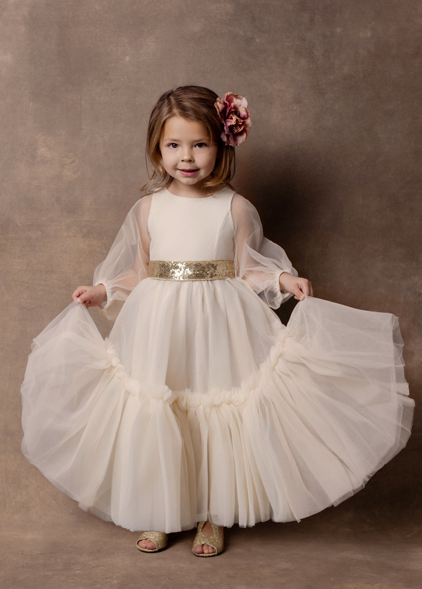 Transform your little one’s wardrobe with our Tianna Dress, designed to capture imagination and elegance. This enchanting dress features a full tulle skirt that creates a beautiful, flowing sweep, perfect for any special occasion or playtime adventure. With its ethereal fabric and charming design, this dress is ideal for making your little girl feel like a princess.