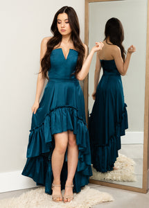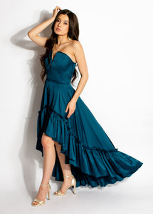 Be bold in this eye-catching strapless silhouette. Featuring a fitted bodice and playful ruffled hemline, you'll be sure to stand out in style.