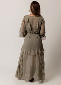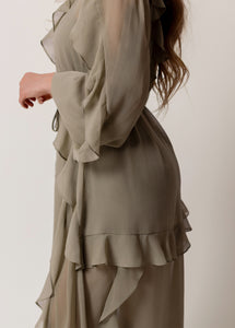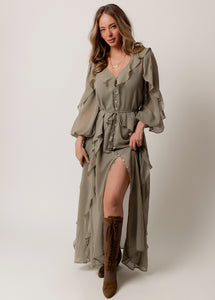 This elegant button-down dress features a flattering V-neckline and a straight fit enhanced by a self-fabric drawcord with thread tassels for a custom silhouette. Delicate flounce ruffles are sewn along the neckline and bottom hem, while vertical ruffles add soft, feminine structure throughout. The sleeves showcase a 3" topped-on flounce detail that wraps gracefully from the front armhole to the back, finished with 1/4" self-fabric binding at the cuff and placket. Shell buttons run down the front and open at the bottom for added movement, with a final 12L shell button securing the sleeve. Complete with thread belt loops at the side seams, this boutique dress is a romantic yet modern must-have for any women’s wardrobe.