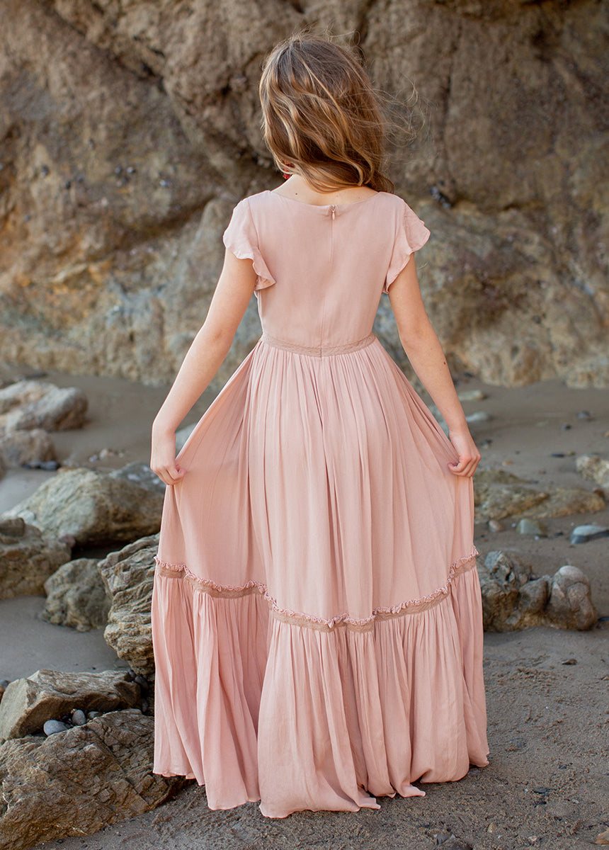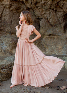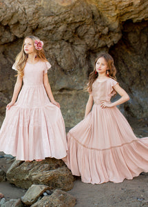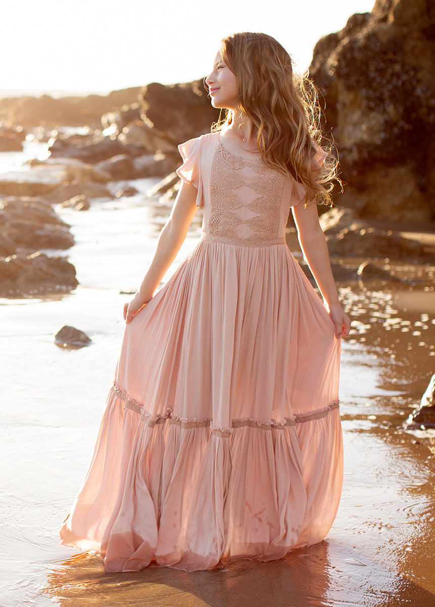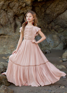 This fan-favorite maxi dress features a beautifully soft and full tiered skirt, making it a stunning choice for any occasion. The bodice is elegantly embellished with a delicate lace panel and accented with crochet trim throughout, adding a touch of sophistication. Designed with a center back invisible zipper, it offers a seamless look and easy wear. With flutter sleeves and a large sweep, this maxi-length dress provides both comfort and style. Crafted from a blend of 65% rayon and 35% polyester for the self, with 100% polyester for the lining and lace, it's machine washable (inside out) and easy to care for, ensuring your little looks fabulous with minimal effort.
