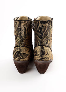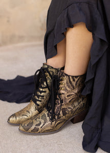 Meet your new favorite bootie—the Virginia Boot in Gold Lace! With its intricate lace detailing, these boots effortlessly add to any outfit. Featuring functional laces and an inner zipper for easy wear, they also boast a stylish 2.5-inch leather stacked heel. Made from 100% polyester, these boots are both chic and durable. Easy to maintain, simply wipe clean to keep them looking fresh and fabulous.