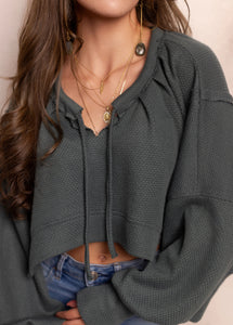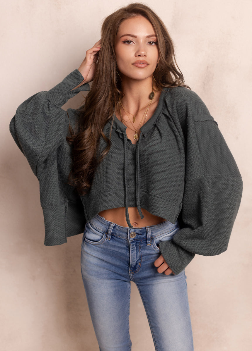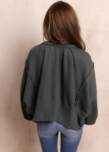 The Viv Sweater blends relaxed comfort with stylish, modern details. It features a soft V-neckline with a charming drawstring tie that adds a touch of feminine ease. Exposed raw seams along the sleeves give it a lived-in, effortless look, while the foldover cuffs add subtle structure. The curved high-low hemline creates a flattering, easy drape that pairs beautifully with jeans or leggings. Finished with a wide foldover hem band, this sweater is the perfect mix of laid-back and chic for everyday wear.