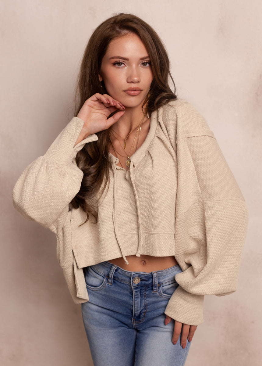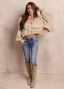 The Viv Sweater blends relaxed comfort with stylish, modern details. It features a soft V-neckline with a charming drawstring tie that adds a touch of feminine ease. Exposed raw seams along the sleeves give it a lived-in, effortless look, while the foldover cuffs add subtle structure. The curved high-low hemline creates a flattering, easy drape that pairs beautifully with jeans or leggings. Finished with a wide foldover hem band, this sweater is the perfect mix of laid-back and chic for everyday wear.
