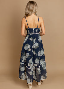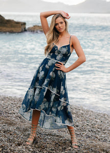 Turn heads in our elegant high-low midi length dress, designed for a flattering and feminine silhouette. The high waist creates a sleek, elongated look, while the fitted bodice enhances your shape for a tailored fit. Featuring a delicate eyelet trim, this dress adds a touch of texture and charm to the design. Crafted from lightweight chiffon, it drapes beautifully and moves gracefully with every step. The lined self ensures comfort and coverage, making this dress perfect for both casual outings and formal events.