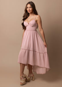 Turn heads in our elegant high-low midi length dress, designed for a flattering and feminine silhouette. The high waist creates a sleek, elongated look, while the fitted bodice enhances your shape for a tailored fit. Featuring a delicate eyelet trim, this dress adds a touch of texture and charm to the design. Crafted from lightweight chiffon, it drapes beautifully and moves gracefully with every step. The lined self ensures comfort and coverage, making this dress perfect for both casual outings and formal events.