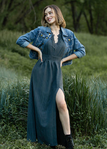 Nice staple dress that is unique. The slit up the leg falls in just the right place ;when you walk, your boot and leg peep through. If I were to name this dress, I would call it "The Girl next Door." This dress elevates a Country Girl Style. If you add a leather headband and accessories, it goes Bohemian.