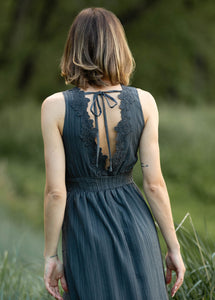 Introducing the Zoie Dress in Slate, a simple yet elegant piece perfect for any occasion. This maxi-length dress features a flattering V-neck and an open back with a tie, ensuring a stylish fit. The stretchy waist and leg slit add a touch of allure, while the mini-length lining provides comfort and coverage. Crafted from high-quality materials—100% polyester for the self and a blend of 97% polyester with 3% spandex for the lining—this dress is designed for both style and durability. Easy to care for with hand wash only and line dry instructions, the Zoie Dress is a versatile addition to your wardrobe that effortlessly embraces chic simplicity.